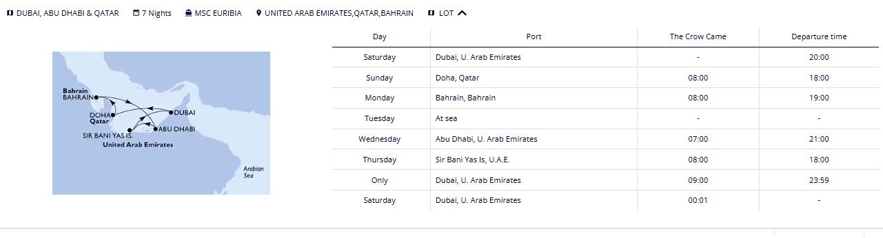 برنامه سفر ((ورود به بندر ابوظبی پایتخت شیخ نشین امارات در ساعت 07:00 صبح، امکان بازدید از جاذبه های فراوان گردشگری این شهر از جمله موزه لوور ابوظبی و مجموعه فراری ورلد ابوظبی، ترک بندر ابوظبی در ساعت 21:00 شب و حرکت به سمت بندر سیر بنی یاس امارات.))
