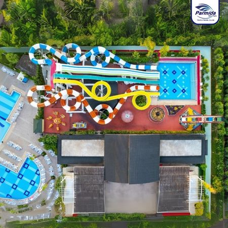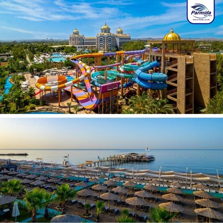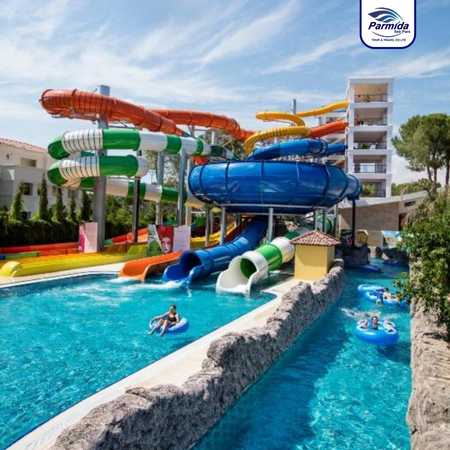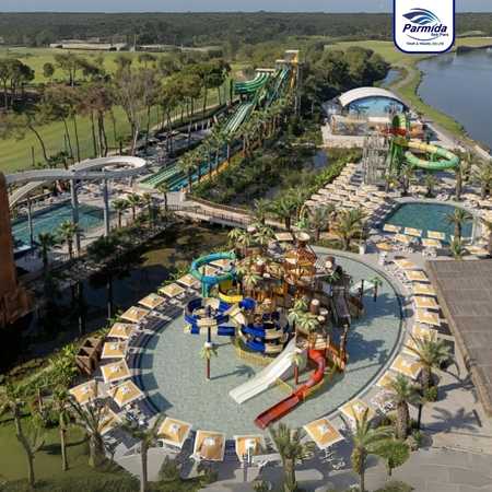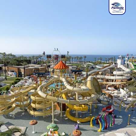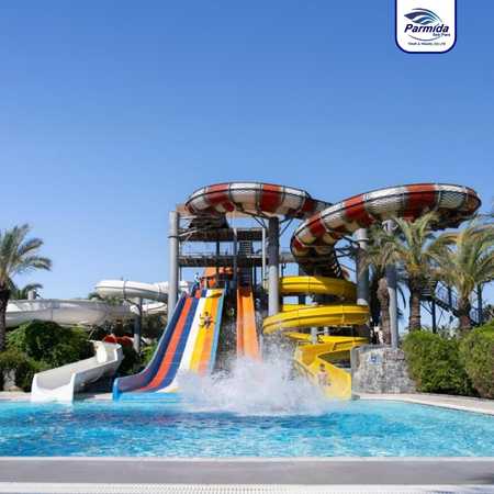 یکی از برجستهترین امکانات این هتل، پارک آبی گسترده با بیش از ۵۵ سرسره و جاذبههای متنوع آبی است که برای همه سنین مناسب بوده و لحظاتی پرهیجان و خاطرهانگیز را رقم میزند. استخرهای موجدار، رودخانههای آرام و سرسرههای سرعتی، از محبوبترین بخشهای این پارک آبی هستند.